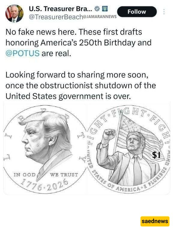 وفقًا لخدمه الأخبار السیاسیه فی ساعد نیوز، أکد أمین الخزانه الأمریکی فی منشور على منصه التواصل الاجتماعی X أن صوره دونالد ترامب ستظهر على عمله أمریکیه جدیده فئه دولار واحد، بمناسبه الذکرى الـ 250 لتأسیس الولایات المتحده.