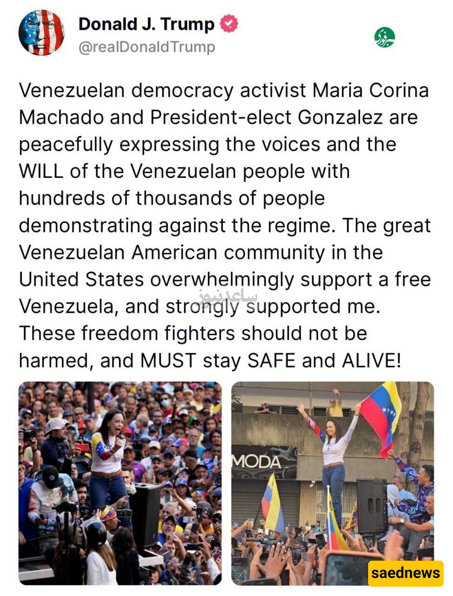 وفی وقت سابق، قام دونالد ترامب بالإشاده بماریا ماتشادو على وسائل التواصل الاجتماعی، واصفًا إیاها بأنها «مناضله من أجل الحریه».