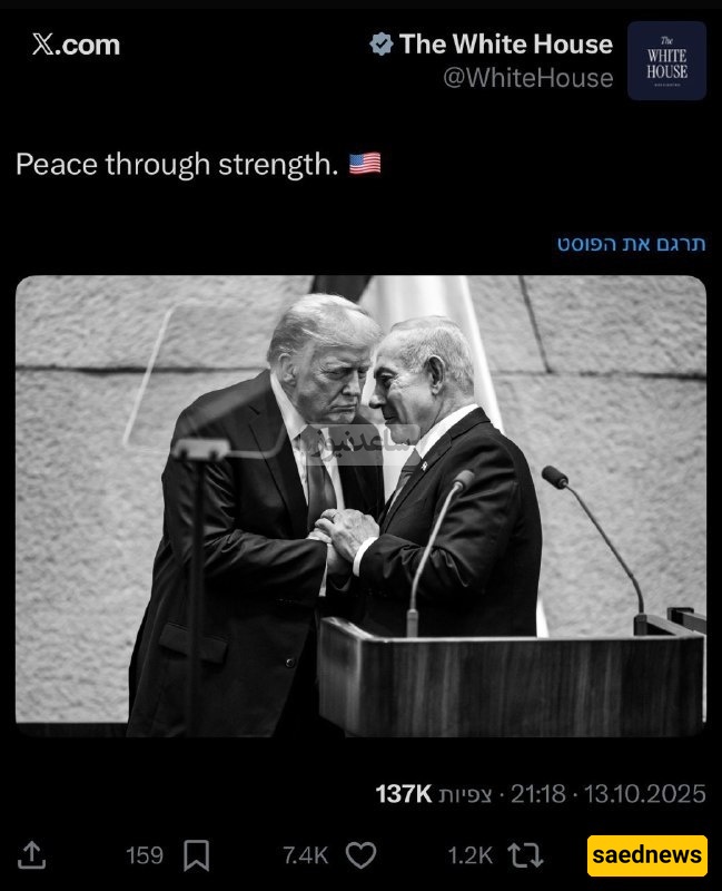 ساعدنیوز: البیت الأبیض یشارک صوره بعنوان "السلام عبر القوه" على إکس
