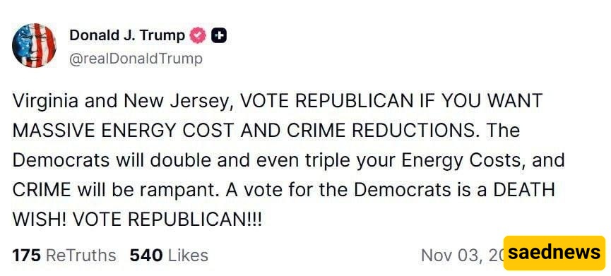 وفقًا لخدمه السیاسه فی وکاله “ساعد نیوز”، دعا دونالد ترامب فی رساله قصیره نشرها على شبکه التواصل الاجتماعی “تروث سوشیال” أنصاره فی فرجینیا ونیوجیرسی إلى "التصویت للجمهوریین". وحذر فی منشوره بلغه قویه ومباشره من أن انتخاب الدیمقراطیین سیؤدی إلى ارتفاع أسعار الطاقه وزیاده معدلات الجریمه.