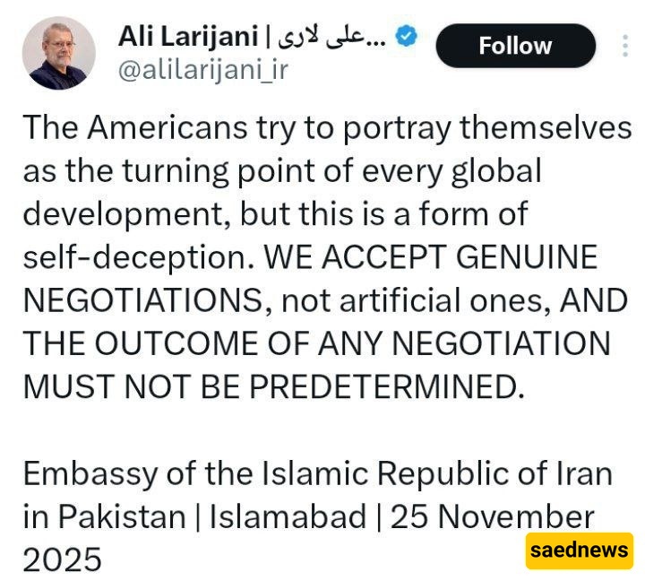 وفقًا لمکتب السیاسه فی ساعد نیوز، حذر علی لاریجانی، أمین المجلس الأعلى للأمن القومی، فی منشور على منصه X، مما وصفه بالدور المزعوم لواشنطن فی التطورات العالمیه، داعیًا إلى «مفاوضات صادقه وحقیقیه».