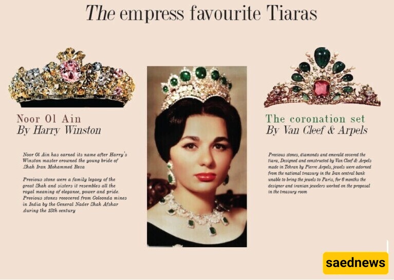 من بین مجوهرات النساء الملکیه، یستحق تاج نور العین، الذی صُنع لزفاف فرح ومحمد رضا بهلوی، الذکر. یُعد واحدًا من أشهر وأغلى تیجان عصر بهلوی، وقد کُلف به محمد رضا وصنع بواسطه هاری وینستون عام 1958. التاج مزین بالألماس الوردی بوزن 60 قیراطًا المستورد من الهند بواسطه جنود إیرانیین، ویجسد الفخامه الملکیه. ارتدت فرح فی لیله زفافها عقدًا مطابقًا وأقراط دمعه وسوارًا کمثله، جمیعها من الألماس.