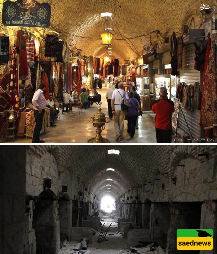 یقع سوق المدینه التاریخی أو سوق حلب فی مرکز المدینه، وکان أکبر سوق مغطى فی العالم، یمتد 13 کیلومترًا عبر الأزقه الضیقه والمتعرجه. کان السوق فی الماضی مرکزًا للسلع الفاخره مثل الحریر الإیرانی الخام والتوابل الهندیه، بینما کان السکان المحلیون یشترون الصوف الفاخر والمنتجات الزراعیه وغیرها من الضروریات. أُدرج السوق على قائمه التراث العالمی للیونسکو عام 1986، لکنه الآن یترنح بین الأنقاض. دُمِّر جزء کبیر منه فی 25 سبتمبر 2012، ولم یتبق سوى بقایا السوق الصاخب الذی کان یعج بالحیاه.