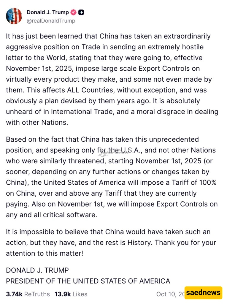 صرح ترامب بأن هذا القرار یأتی ردًا على احتمالیه فرض الصین قیودًا على تصدیر عناصر الأرض النادره، التی تُعد حیویه فی إنتاج أشباه الموصلات ورقائق الحاسوب. وکتب فی منشور على شبکه التواصل الاجتماعی Truth Social أن بکین أرسلت "رساله عدائیه جدًا" للعالم، معلنه نیتها فرض قیود تصدیر شامله على معظم منتجاتها المصنعه بدءًا من 1 نوفمبر 2025.