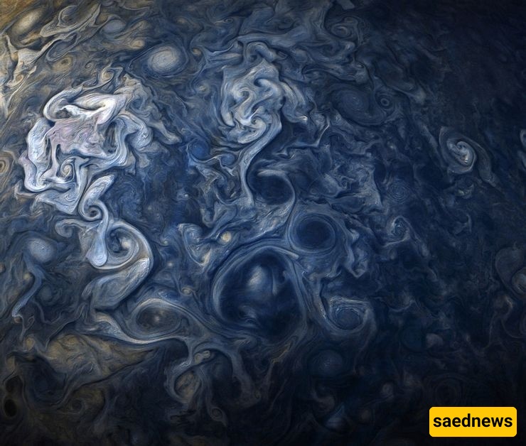 فی علم الفلک، یُذکر المشتری لحجمه الهائل وبقعته الحمراء العظیمه—عاصفه ضخمه عرضها ضعف عرض الأرض. تُظهر هذه الصوره المحسنه الغیوم وهی تلقی بظلالها عبر الکوکب، ملتقطه من زاویه أعلى، ما یمنحنا منظورًا جدیدًا ومدهشًا للکوکب الغازی.