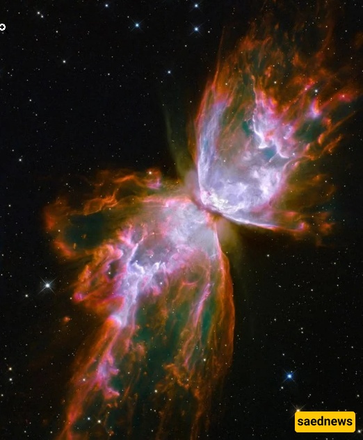 تلتقط هذه الصوره المذهله من تلسکوب هابل نجمه تحتضر تنفجر إلى فصّین ضخمین من الغاز الساخن والحطام. کانت النجمه أکبر خمس مرات من الشمس، منتجه أحد أکثر المواقع حراره فی المجره، بدرجه حراره 20,000°م.