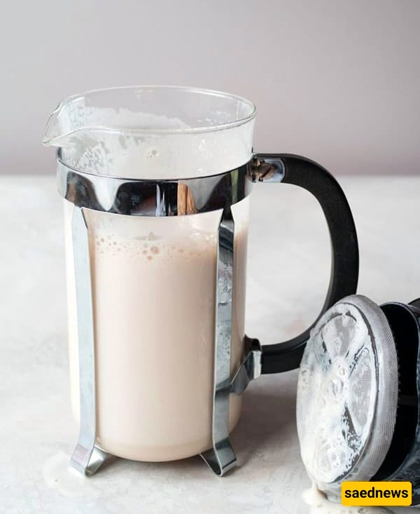 اضغط المکبس برفق لفصل السائل عن اللب. هکذا یصبح حلیب اللوز الطازج جاهزًا!