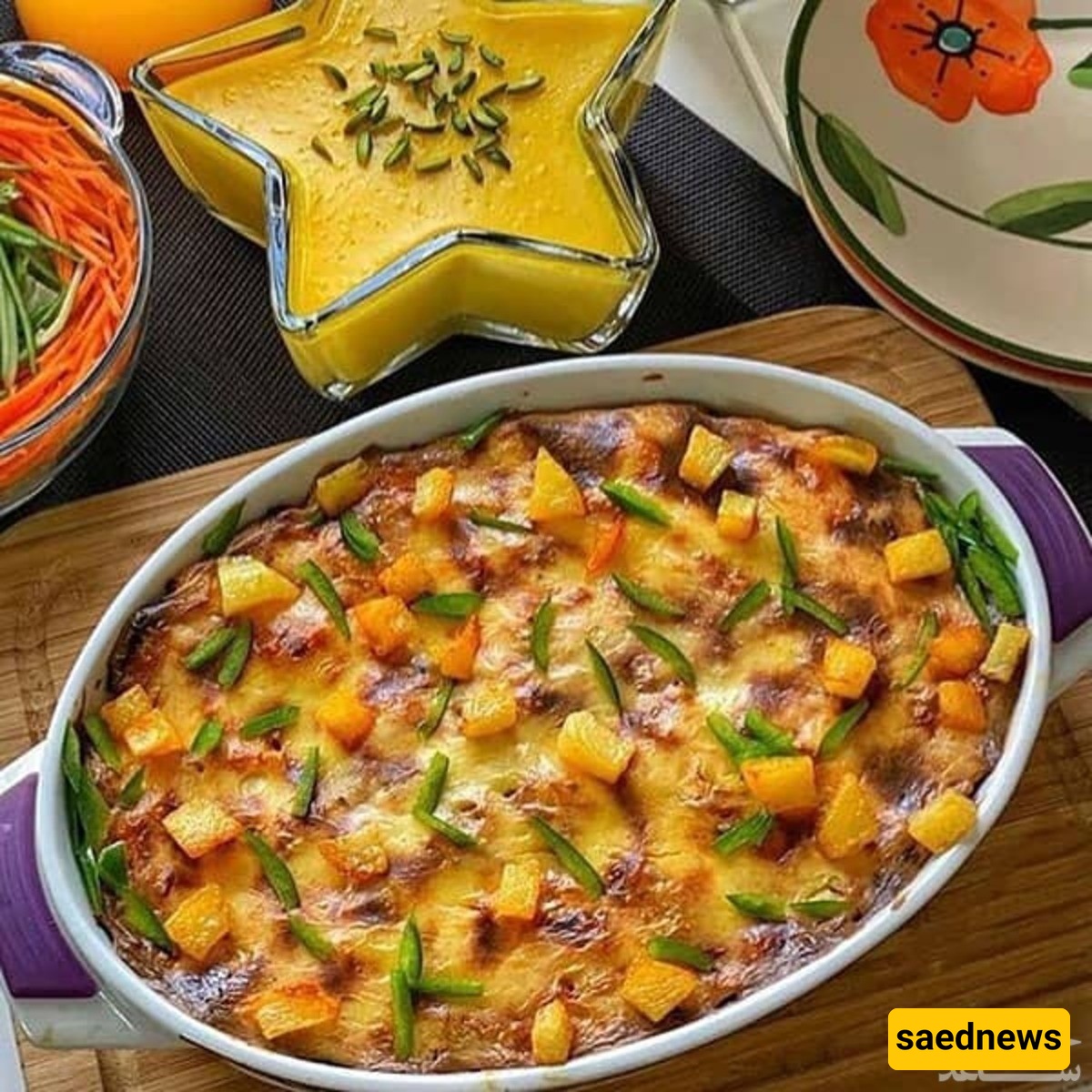 فی قدر کبیر، سخّن زیت الزیتون مع ملعقتین کبیرتین من الزبده على نار متوسطه إلى عالیه. بعد أن تذوب الزبده، أضف البصل المفروم والجزر المبشور وملعقه صغیره من الملح. قلّب المکونات لمده 8–10 دقائق حتى تصبح طریه وذهبیه اللون.
