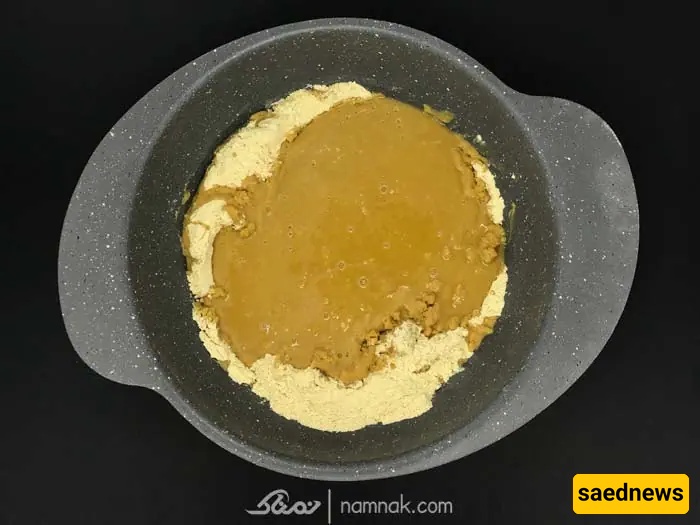 فی قدر آخر، قم بإذابه الزبده مع الزیت. أضف هذا المزیج تدریجیًا إلى الدقیق المحمص مع التحریک المستمر حتى یمتزج بالکامل ویصبح لونه ذهبیًا. کلما طالت مده التحریک على النار، أصبح الحلو أغنى وأغمق لونًا.