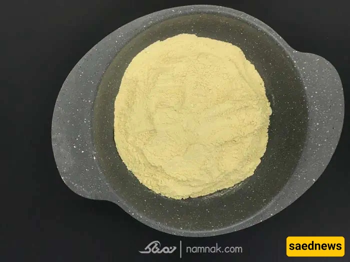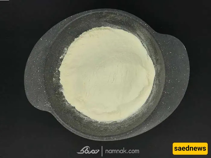 نخل الدقیق ثلاث مرات لیصبح خفیفًا وهشًا. ضع الدقیق فی قدر مناسب على نار متوسطه وحمصه مع التحریک المستمر حتى یزول الطعم النیء ویأخذ اللون الکریمی.
