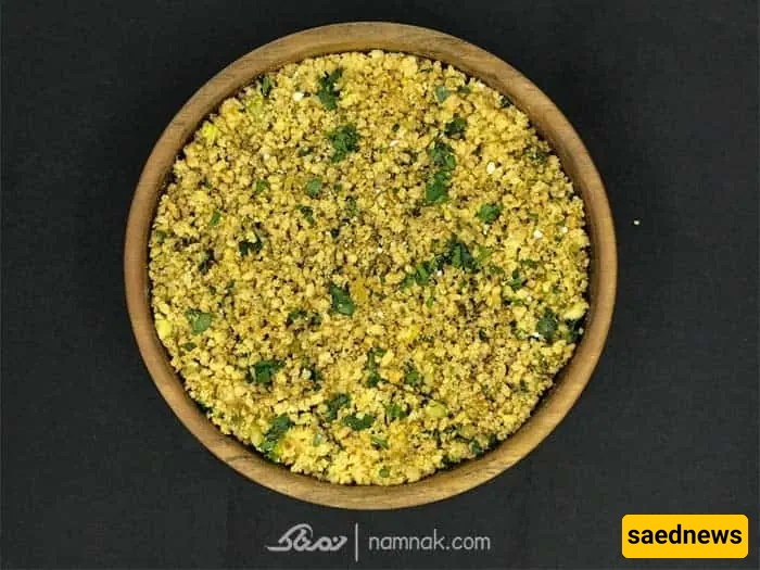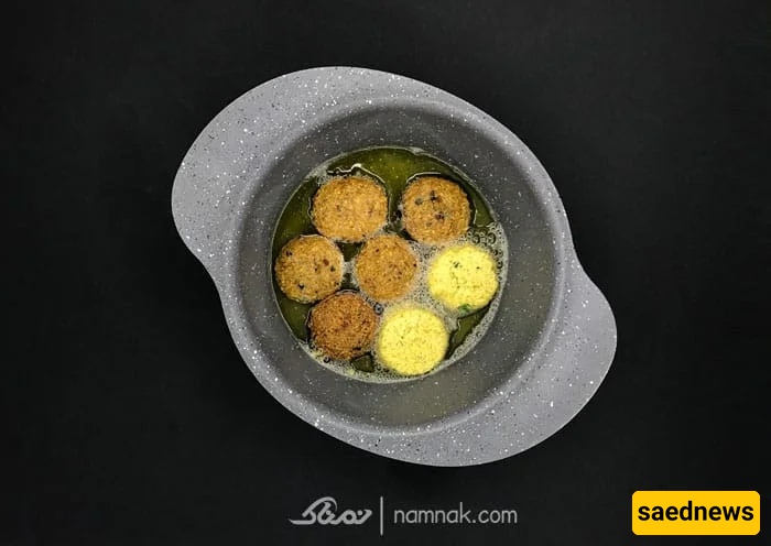أضف الملح والفلفل والتوابل إلى الخلیط. باستخدام ملعقه أو قوالب الفلافل، شکّل الخلیط على شکل کرات صغیره نصف کرویه.