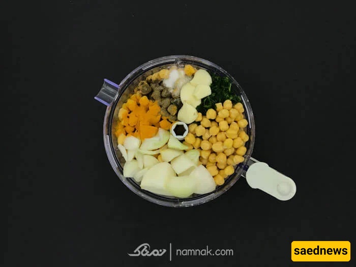 اخلط جمیع المکونات فی محضّر الطعام حتى تتجانس دون أن تتحول إلى عجینه ناعمه؛ یجب أن یبقى الخلیط خشن قلیلًا. أضف قلیلًا من زیت الزیتون إذا لزم الأمر لتسهیل التشکیل.