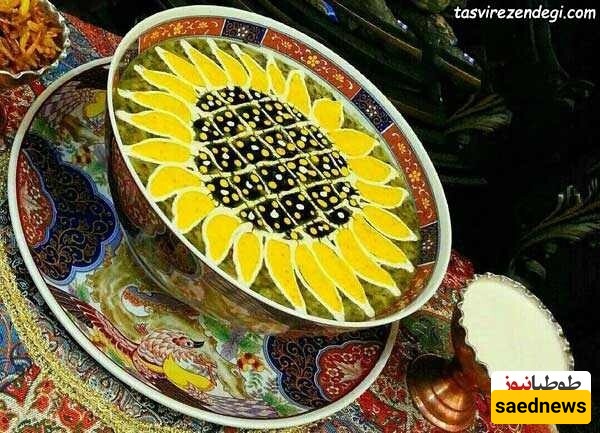 هنا، تُرتَّب البصل المقلی، الکشک العادی، الکشک بالزعفران، والنعناع المقلی فی نمط دائری. ثم، باستخدام عود أسنان أو عود ثقاب، تُرسم خطوط برفق من المرکز نحو حافه الوعاء على فترات منتظمه.