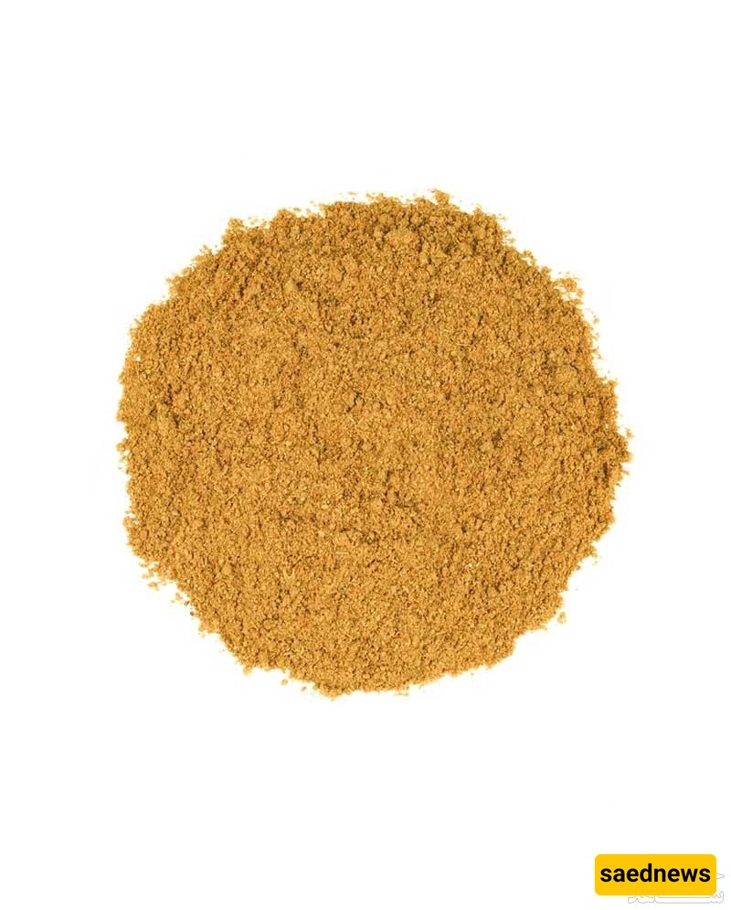 مسحوق الکرکم: شائع فی المطبخ الإیرانی، یضیف اللون ویتمیز بخصائص مضاده للالتهاب والسرطان، ویدعم صحه القلب.