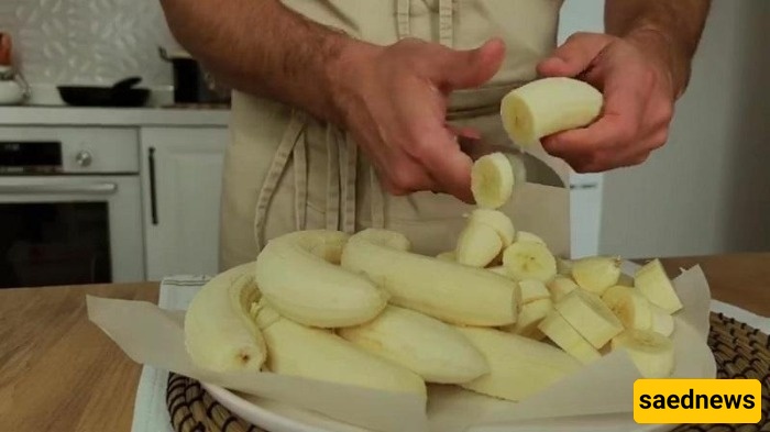 قشّر الموز وقطّعه إلى شرائح بسمک 2–3 سم، وتخلص من الأجزاء الداکنه أو الطریه. ضع الشرائح فی کیس قابل للإغلاق أو حاویه وضعها فی الفریزر لمده 3–4 ساعات.