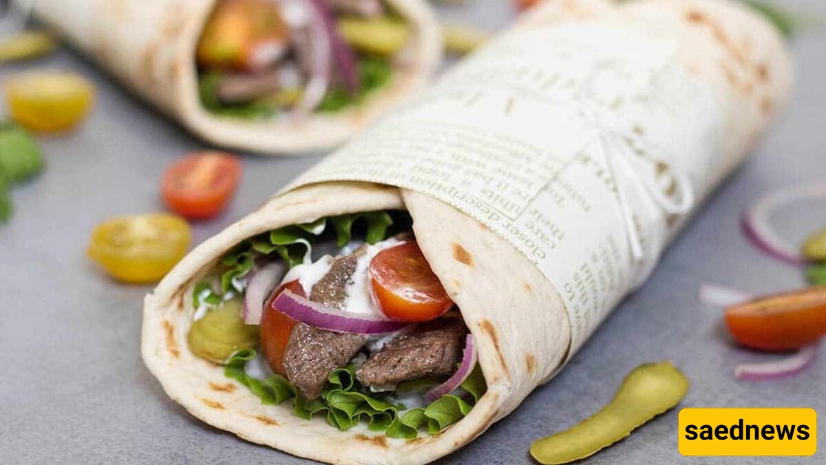 صب صلصه الزبادی والمایونیز فوق اللحم. قطّع الطماطم والمخللات والخس وأضف کمیه مناسبه إلى کل بیتا. أخیرًا، لف الخبز على شکل رول وقدمه.