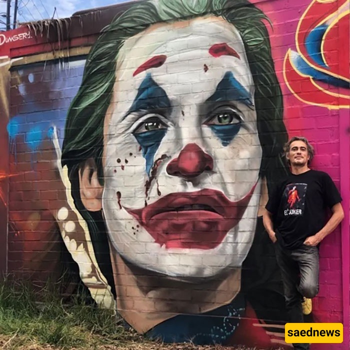 جداری فوتوریلستی یظهر خواکین فینیکس فی شخصیه الجوکر، مرسوم بتفاصیل مذهله على جدار من الطوب. یقف الفنان بجانب العمل، مما یبرز کلًا من الحجم وواقعیه الشخصیه.
