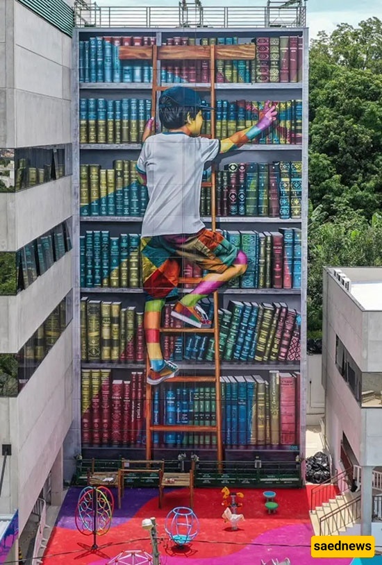 على واجهه مبنى طویل، تصور جداریه ملونه طفلًا یتسلق سلمًا للوصول إلى مکتبه ضخمه. تتباین ألوان قوس قزح للطفل مع التفاصیل الفائقه الواقعیه للکتب.