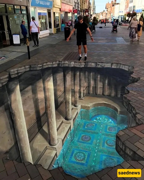 رسم شارع ثلاثی الأبعاد صُمم کحفره ضخمه فی الرصیف، مع درجات وأعمده تنحدر إلى مسبح مُزخرف ببلاط جمیل أسفلها. یمکن للمشاه الوقوف عند الحافه وکأنهم یقفون على أطلال غارقه.