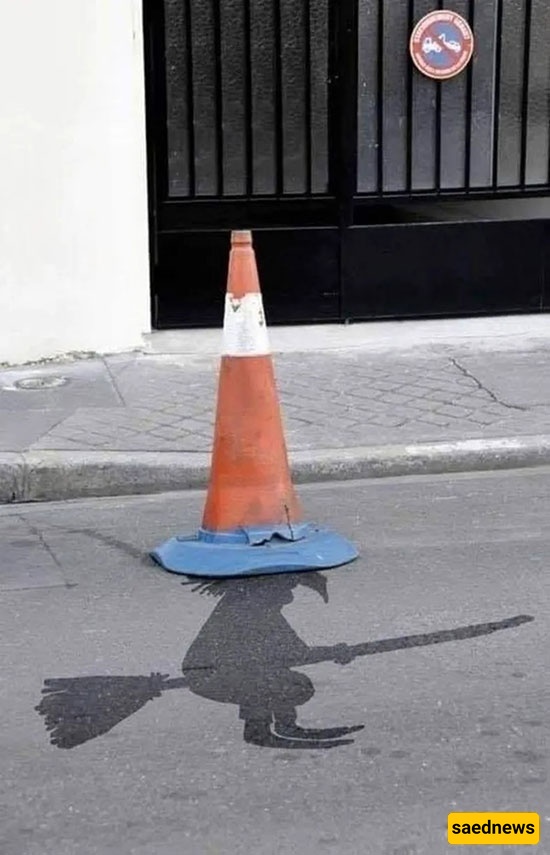 مخروط مروری فی الشارع یُدمج مع ظل مرسوم لساحر یطیر على مکنسه، لیحول جسمًا بسیطًا إلى وهم مرح.