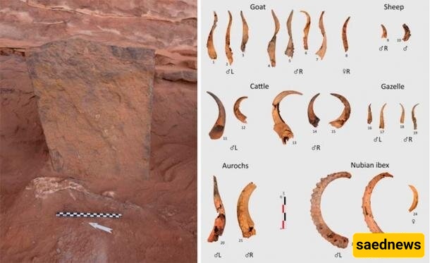 ومن بین الاکتشافات مئات الجماجم البشریه وقرون الحیوانات، والتی کانت فی الأصل تعود إلى أنواع مثل الأبقار والماعز. وقد تم العثور على ترتیبات مشابهه للرؤوس والقرون فی مواقع ما قبل التاریخ فی الشرق الأوسط، بما فی ذلک موقع یمنی حیث عُرضت جماجم الأبقار فی تشکیلات دائریه.