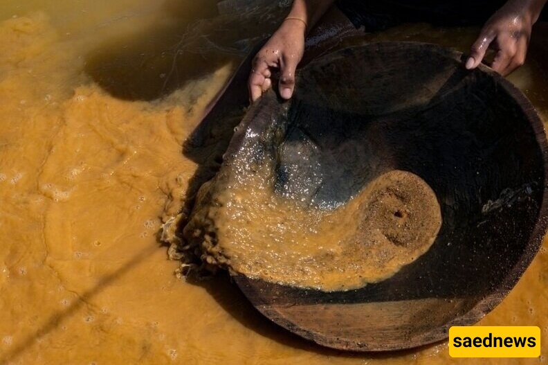 یُغسل الطین الثقیل فی أوعیه خشبیه بعد استخراجه. یشرح مارتی́n: "کل ما هو ذهب یلتصق بالزئبق"، وهی ماده سامه یستخدمونها لاستخراج الذهب من المناجم، وتشکل خطراً على البیئه.