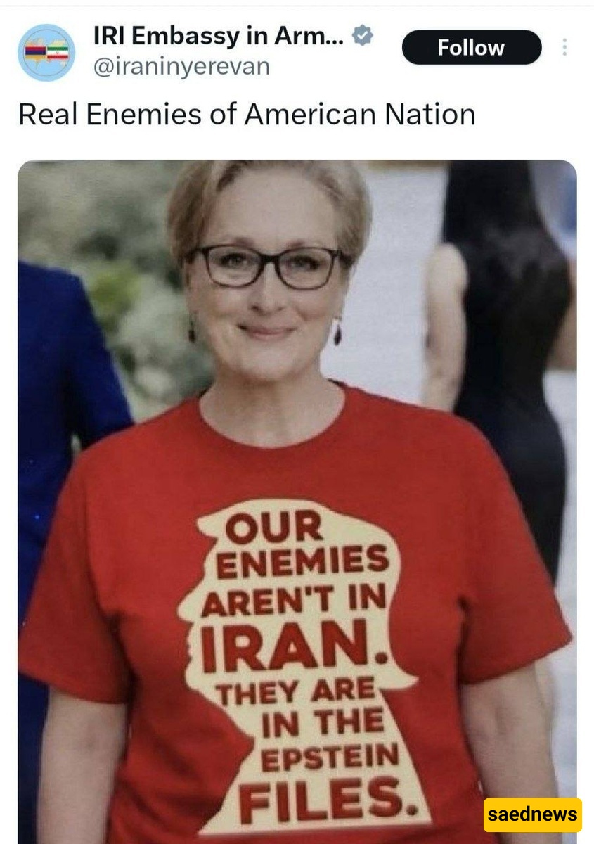 وفقًا لخدمه الفن والإعلام فی وکاله ساعدنیوز، نشرت سفاره الجمهوریه الإسلامیه الإیرانیه فی أرمینیا صوره على منصه “إکس” (تویتر سابقًا) تُظهر الممثله الهولیوودیه الشهیره میریل ستریب وهی ترتدی قمیصًا مکتوبًا علیه: