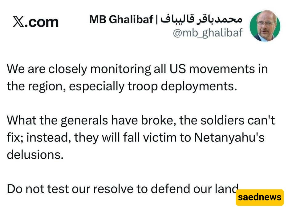 وفقًا لمکتب الشؤون السیاسیه فی وکاله ساعد نیوز، ونقلًا عن خبر أونلاین، کتب محمد باقر غالیباف، رئیس مجلس الشورى الإسلامی، على منصه التواصل الاجتماعی X: