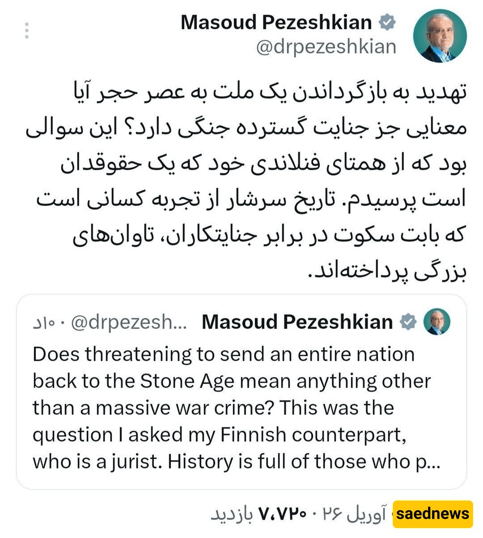 ساعدنیوز: الرئیس یکتب على منصه التواصل X: "تهدید إعاده أمه إلى العصر الحجری—هل یعنی هذا شیئًا سوى جریمه حرب واسعه النطاق؟"