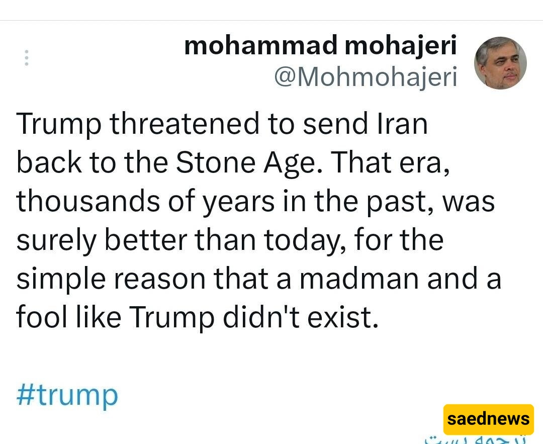 ساعدنیوز: رد محمد مهاجری على تعلیقات ترامب حول إعاده إیران إلى العصر الحجری