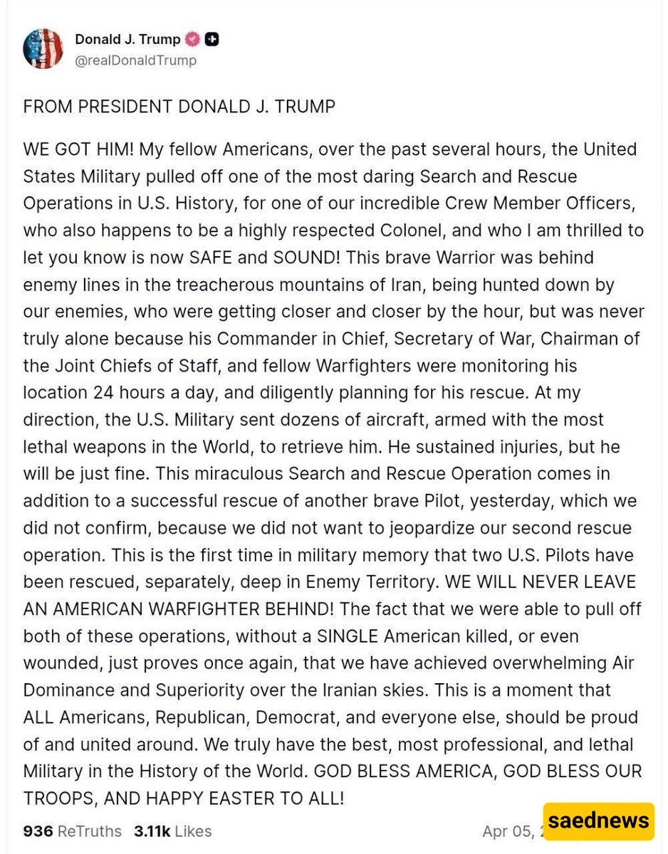 بتوجیهی، نشرت القوات الأمریکیه عشرات الطائرات المسلحه بأخطر الأسلحه فی العالم لاستعادته. وقد أصیب بجروح، لکنه سیتعافى. تأتی هذه العملیه المعجزه بعد نجاح عملیه إنقاذ طیار شجاع آخر أمس فقط—وهی مهمه لم نعلن عنها فی حینه لضمان سریه إنقاذنا الثانی.