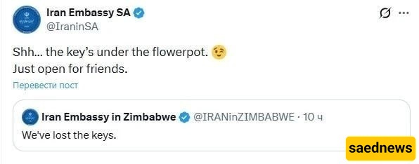 وانضمت البعثه الدبلوماسیه الإیرانیه فی جنوب أفریقیا إلى المزحه، مضیفه: «شش… المفاتیح فی أصیص الزهور. لکننا نفتح الأبواب للأصدقاء فقط».