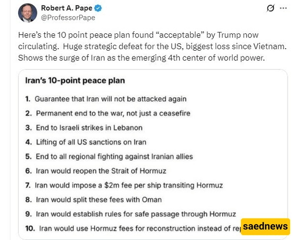 ساعدنیوز: وصف خبیر الشؤون الأمنیه وأستاذ بجامعه شیکاغو روبرت أ. باب قبول دونالد ترامب لمقترح إیران المکوّن من 10 نقاط کأساس لاتفاق لوقف إطلاق النار بأنه «أعظم هزیمه للولایات المتحده منذ حرب فیتنام».