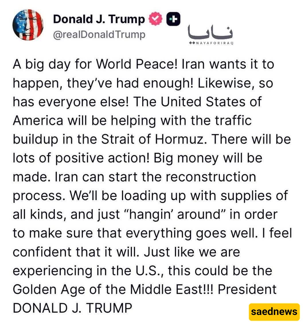 وفقًا لمکتب الشؤون السیاسیه فی وکاله ساعد نیوز، وصف دونالد ترامب فی أحدث تصریحاته التطورات الجاریه بأنها "یوم عظیم للسلام العالمی"، مؤکدًا أن إیران تسعى أیضًا لتحقیق السلام وتهدف لتجاوز الوضع الحالی.