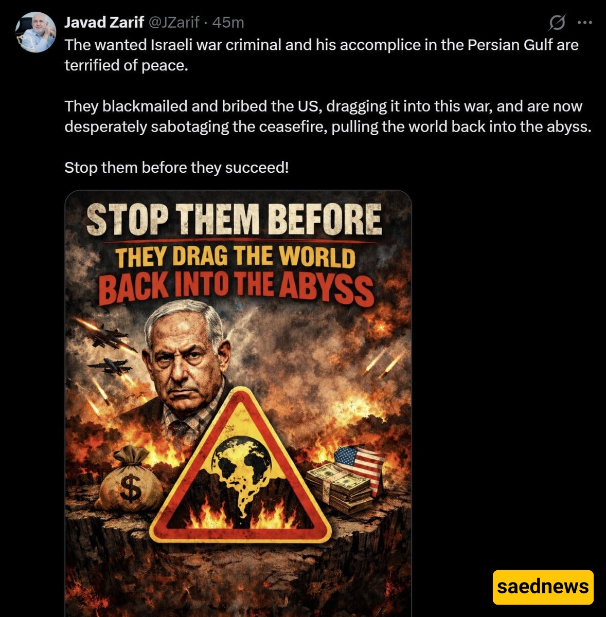 من خلال الابتزاز والرشاوى، جلبوا الولایات المتحده إلى هذه الحرب، والآن یستخدمون کل الوسائل لتخریب وقف إطلاق النار، مما یسحب العالم نحو حافه الهاویه مره أخرى.