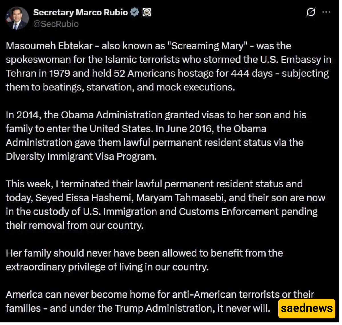 ساعدنیوز: أعلن وزیر الخارجیه الأمریکی مارکو روبیو، فی منشور على منصه التواصل الاجتماعی “إکس”، أنه وبناءً على توجیهاته، تم إلغاء الإقامه الدائمه (البطاقه الخضراء) لسید عیسى هاشمی، نجل معصومه ابتکار، داخل الولایات المتحده الأمریکیه.