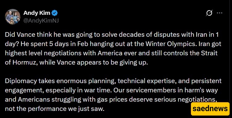 وفقاً للخدمه السیاسیه والتحلیلیه لوکاله «ساعد نیوز»، نشر السیناتور الدیمقراطی عن ولایه نیوجیرسی آندی کیم منشوراً حاداً على منصه «إکس» (تویتر سابقاً) الیوم (الأحد)، انتقد فیه أداء جیه دی فانس، المبعوث الخاص للإداره الأمریکیه فی المفاوضات الأخیره مع الجمهوریه الإسلامیه الإیرانیه، مؤکداً أن واشنطن لم تحقق أی مکاسب فی هذه الجوله من المحادثات.