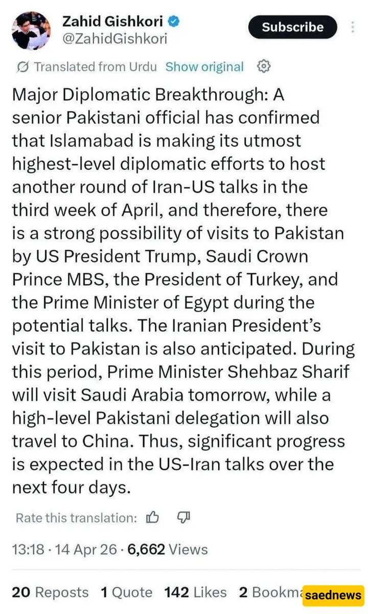 نقلًا عن تقریر أشار إلیه موقع ساعدنیوز عبر Fararu، کتب صحفی باکستانی على منصه X أن مصدرًا باکستانیًا رفیع المستوى أکد أن إسلام آباد تبذل جهودًا دبلوماسیه واسعه لاستضافه جوله جدیده من المفاوضات بین إیران والولایات المتحده خلال الأسبوع الثالث من شهر أبریل.
