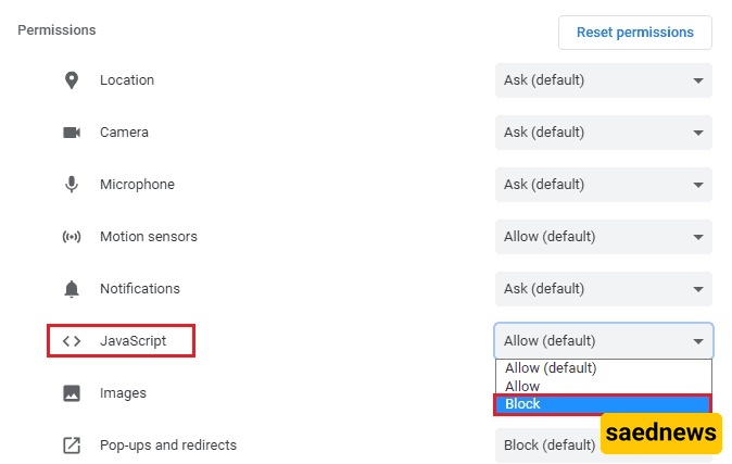 اختر “حظر” لتعطیل JavaScript.