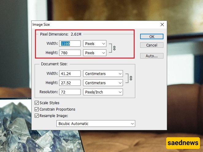ستظهر نافذه جدیده یمکنک من خلالها عرض أبعاد الصوره بالکامل، کما یمکنک تعدیل العرض والارتفاع إلى القیم التی تریدها.