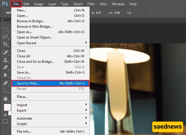 من القائمه العلویه، اختر File (ملف)، ثم اضغط على Save for Web (حفظ للویب) من القائمه المنسدله.