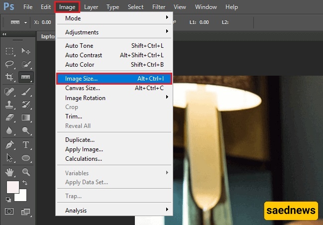 من شریط أدوات فوتوشوب، اختر Image (صوره)، ثم اضغط على Image Size (حجم الصوره).