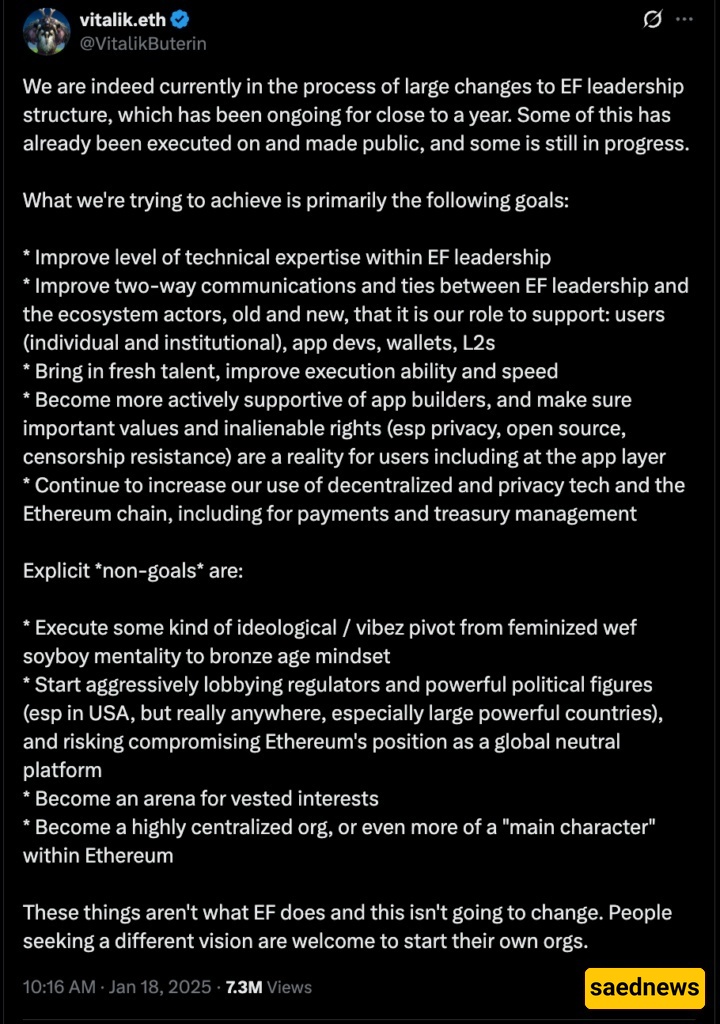 فی ینایر 2025، استجاب فیتالیک بوتیرین لانتقادات متزایده من مجتمع إیثریوم بشأن التوجه طویل المدى للنظام البیئی، وأعلن عن تغییرات جوهریه فی مؤسسه إیثریوم.