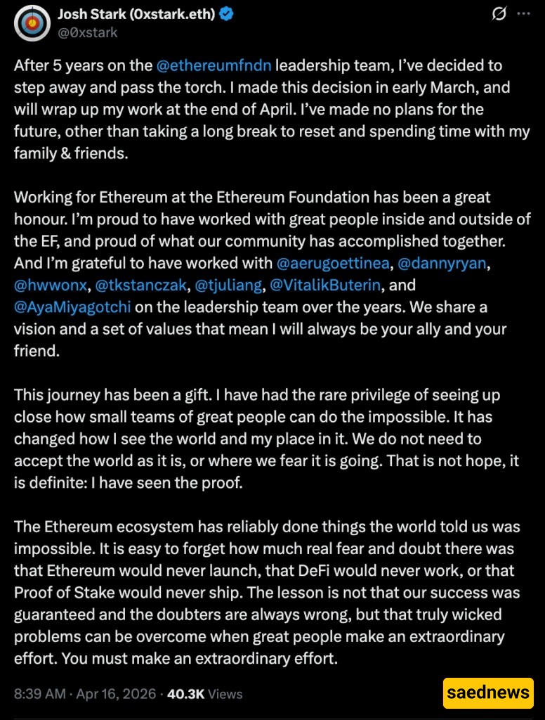 وفقًا لخدمه العلوم والتکنولوجیا التابعه لوکاله “ساعدنیوز”، نقلًا عن Cointelegraph، لم یقدّم جوش ستارک سببًا محددًا لقراره. وفی منشور له على شبکه التواصل الاجتماعی X کتب: