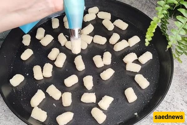 استخدم کیس تزیین مع فوهه (یفضل أن تکون غیر بلاستیکیه) لتشکیل البامیه. ضع قطعه صغیره من العجینه فی الکیس واضغط لدفع العجینه، ثم قصها بالمقص المدهون بالزیت. رتبها على صینیه مدهونه قلیلًا بالزیت.