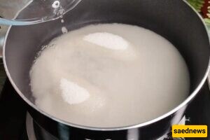 فی قدر مناسب، اخلط السکر والماء والزیت والفانیلیا. ضع القدر على حراره متوسطه حتى یذوب السکر ویغلی الماء.