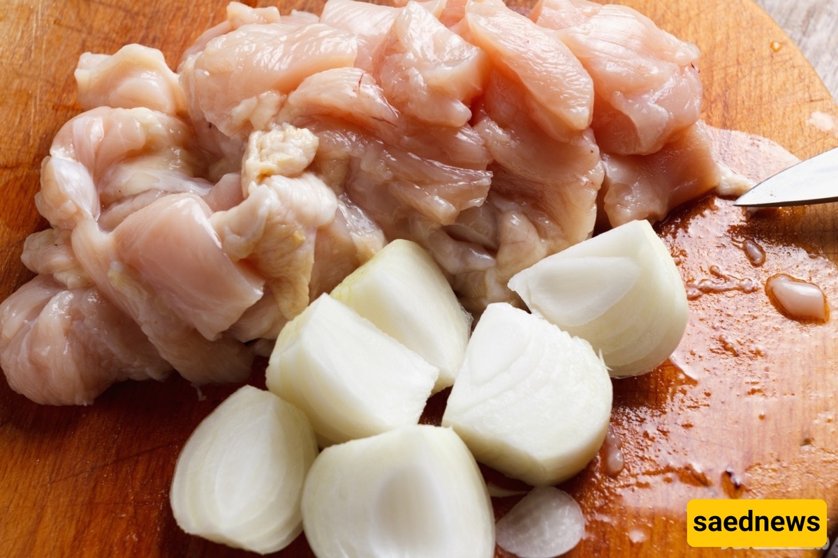 اغسل صدور الدجاج، أزل الجلد وأی عظم. قطّع الدجاج إلى قطع بعرض 4–5 سم (حوالی 140–150 غ لکل قطعه).