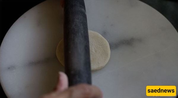 خذ کره عجین واحده وافردها على سطح مرشوش بالدقیق على شکل دائره صغیره (قطر 7–8 سم).