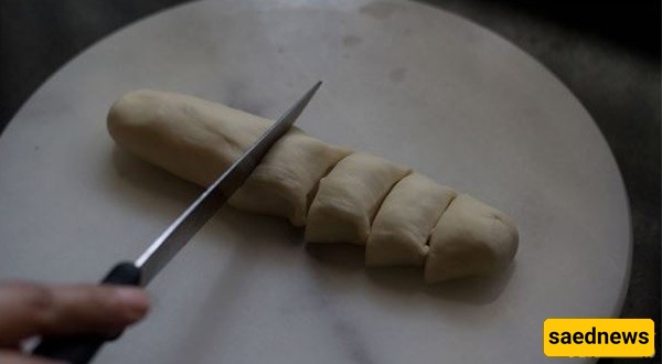 قسّم العجینه إلى جزئین ولف کل جزء على شکل أسطوانه.