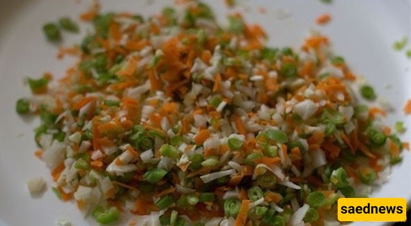 افرم جمیع الخضار (الملفوف، الجزر، الفلفل الرومی، الفاصولیا) ناعماً.